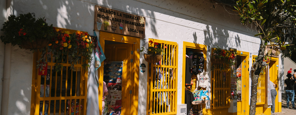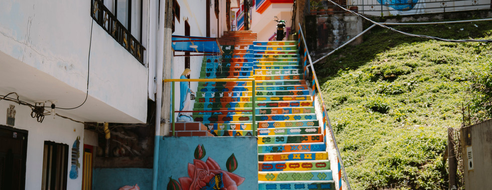 Vorbei an dem wohl belebtesten Spot in Guatapé – einer Straße mit unglaublich vielen bunten Regenschirmen – landeten wir bei der Bäckerei Panadería Orquipan. Ich konnte mich jetzt nicht mehr dagegen wehren und musste eine perfekt runde Mozzarella-Teig-Kugel (Buñuelos) kosten. Es war so viel besser als erwartet – richtig lecker. Nach unserem Mittagessen im Guatacrep' erkundeten wir auch noch die ruhigen Straßen. Wir entdeckten eine untouristische bunte Treppe und viele leere Seitengassen, um tolle Bilder zu machen. Egal in welche Straße man hier hineingeht, es ist einfach so schön. Wie ihr merkt, wir waren begeistert.