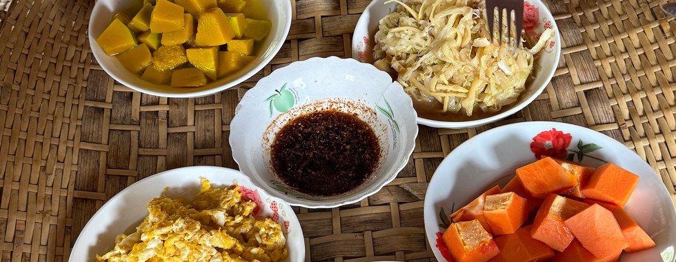 Nach einer Stunde machten wir unsere erste Pause und erreichten nach einer weiteren Stunde das Dorf Khmu und Hmnong Village von NaLuang. Die Strecke ist größtenteils flach mit kleinen Steigungen und Treppen, um Zäune zu überqueren. In Hmnong Village hatten wir die Möglichkeit, uns zu erholen und das Dorf zu erkunden. Wir beobachteten einen älteren Herrn beim Messerschmieden, spielten mit den Kindern und sahen einem Vater dabei zu, wie er Reisblätter zubereitete. Nach einer Weile wurden wir zum Essen in den obersten Stock gerufen. Auf gemütlichen Sitzkissen saßen wir am Boden und genoßen ein köstliches Mahl aus Kraut, Kürbis, Eiern, Soße, Papaya (als Dessert) und klebrigem Reis in einem Bambusbehälter. Es schmeckt anders als das, was wir bisher gegessen hatten, aber unglaublich gut.